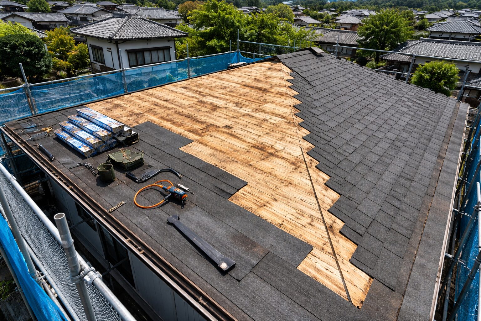 費用の内訳は大きく材料費、足場・養生費、既存屋根撤去と廃棄処分、下地補修と防水下地、諸経費(廃棄物処理費や諸手続き)、施工費に分かれます。足場や撤去費が全体に占める割合は無視できないため、小規模工事でも固定費がかかる点は理解しておくと見積り比較がスムーズになります。